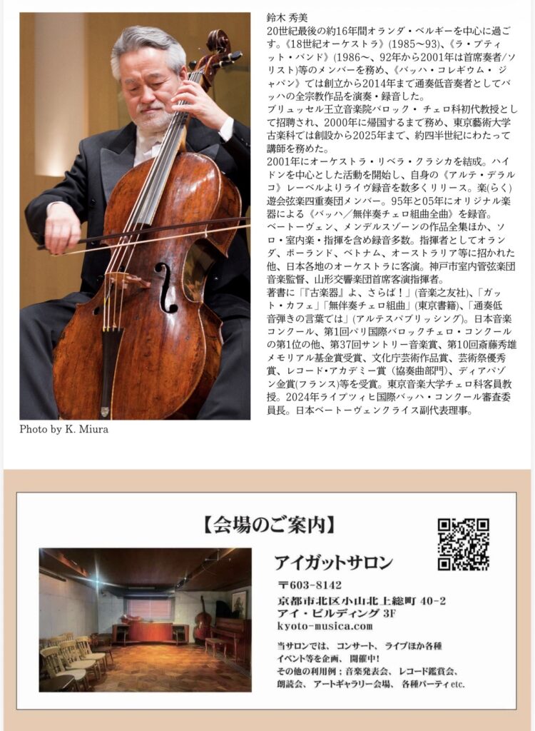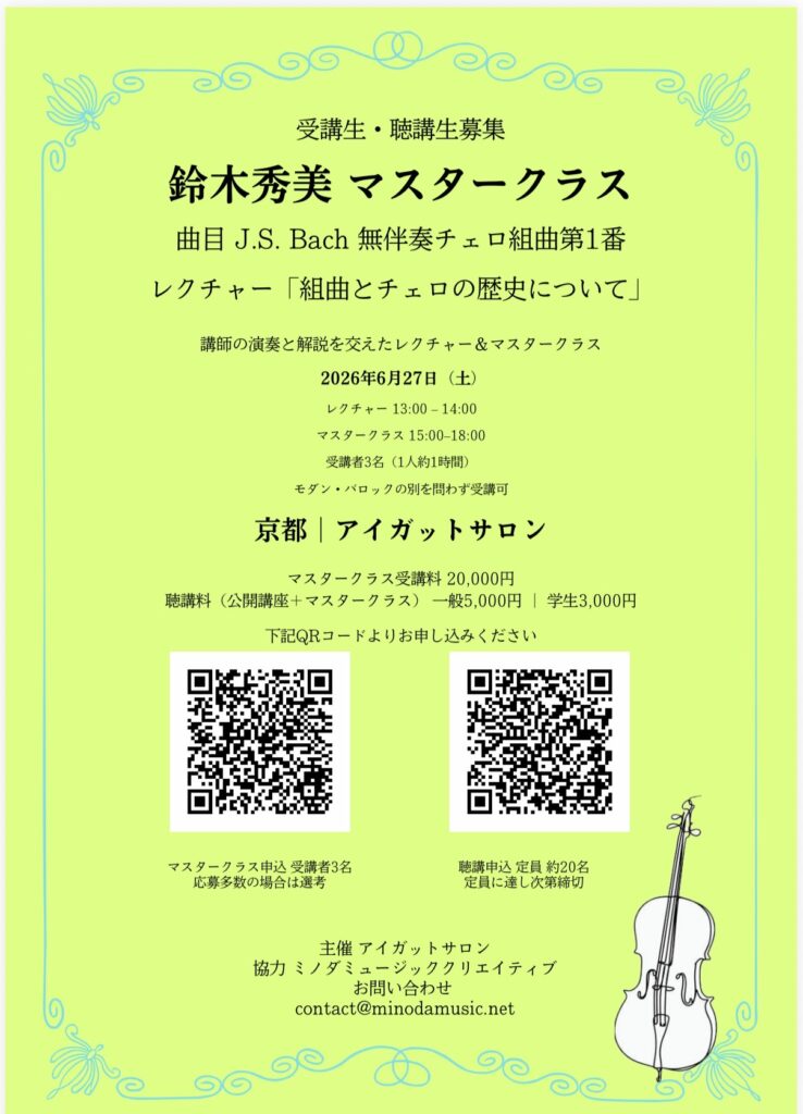 チェリスト鈴木秀美氏によるマスタークラスを開催いたします。